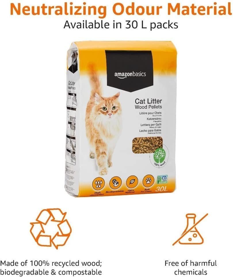• 30 Litre Pack: Highly absorbent Amazon Basics cat litter wood pellets; absorb over 2X of own weight in liquid