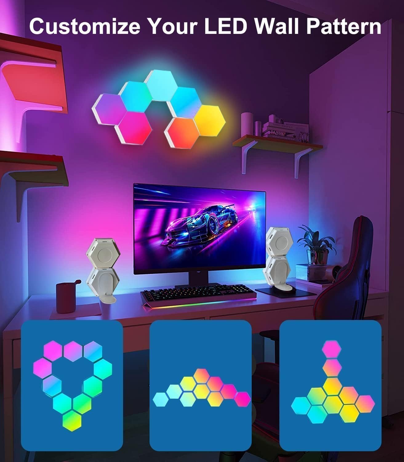 - Customizable Gaming LED Wall Lights: Combining inspiration from honeycomb, building blocks and puzzles, these rgb wall lights allow you to design your own arrangements, creating the ultimate RGB vibe and cozy atmosphere in any space. Hexagon LED lights are perfect for gaming room decorations. Discover endless geometric design, you will be a mural artist of your home. Specially designed to enhance gaming experience, TV, home theater and live streaming