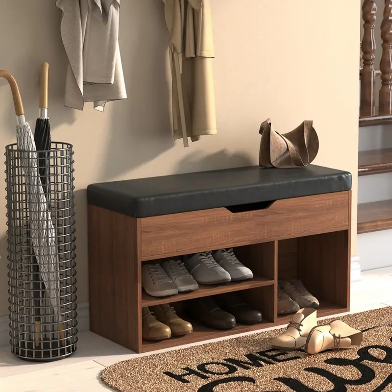 Maximize your home’s functionality and style with the Homy Casa Compact Shoe Storage Bench. Designed for modern living, this 31.5-inch bench features a sleek walnut finish that effortlessly complements any contemporary décor. Its compact size makes it an ideal fit for entryways, hallways, or other small spaces, helping you stay organized without compromising on aesthetics.