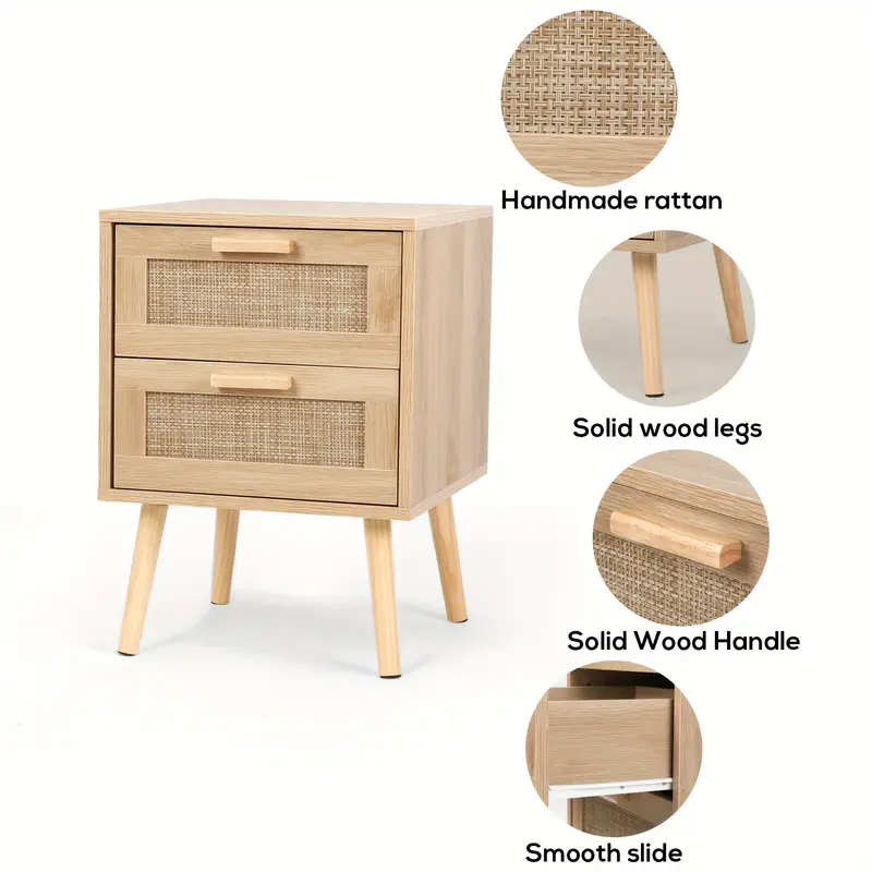 Rattan Nightstand Set, Wooden End Table With 2 Drawers, Solid Wood Legs